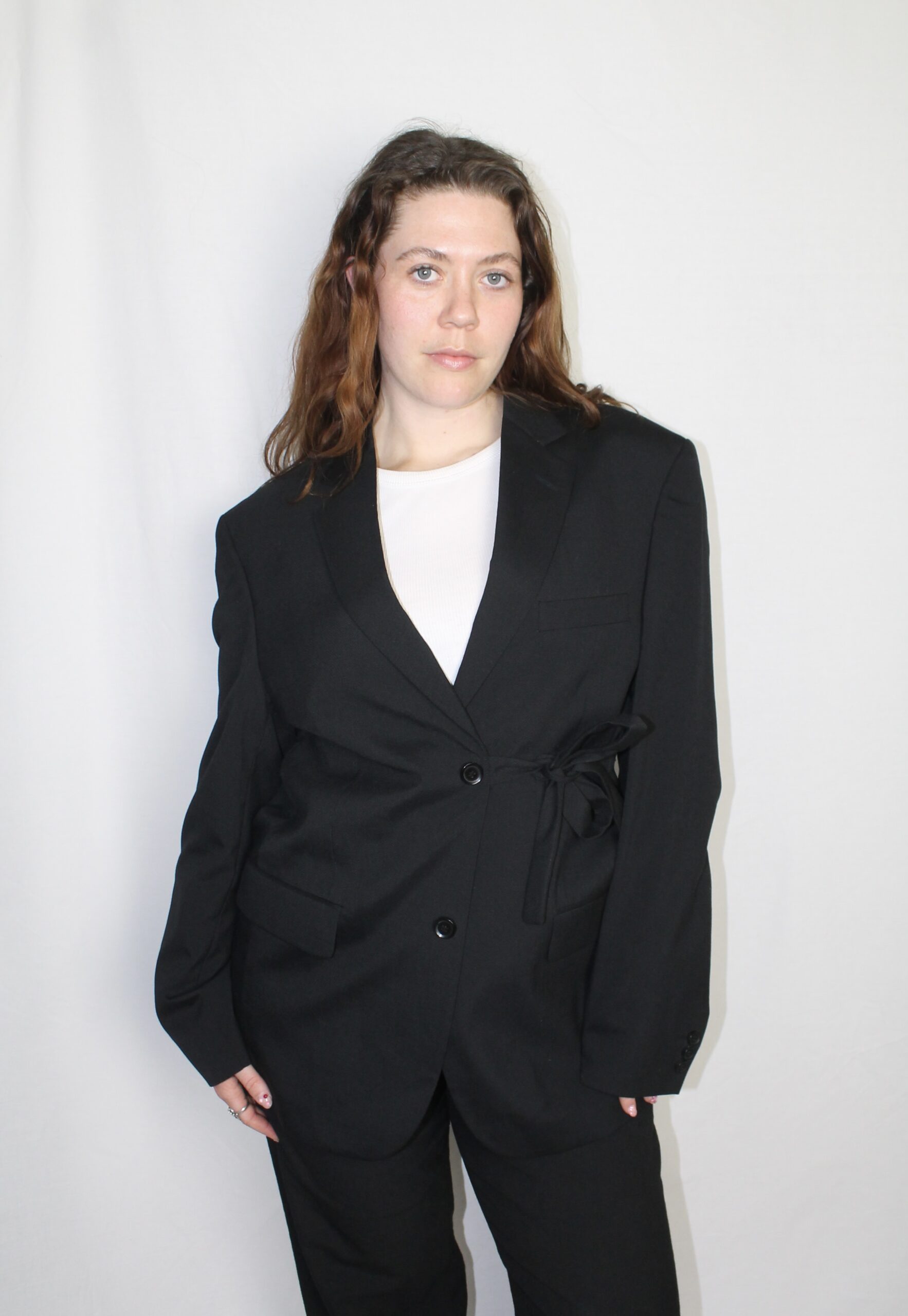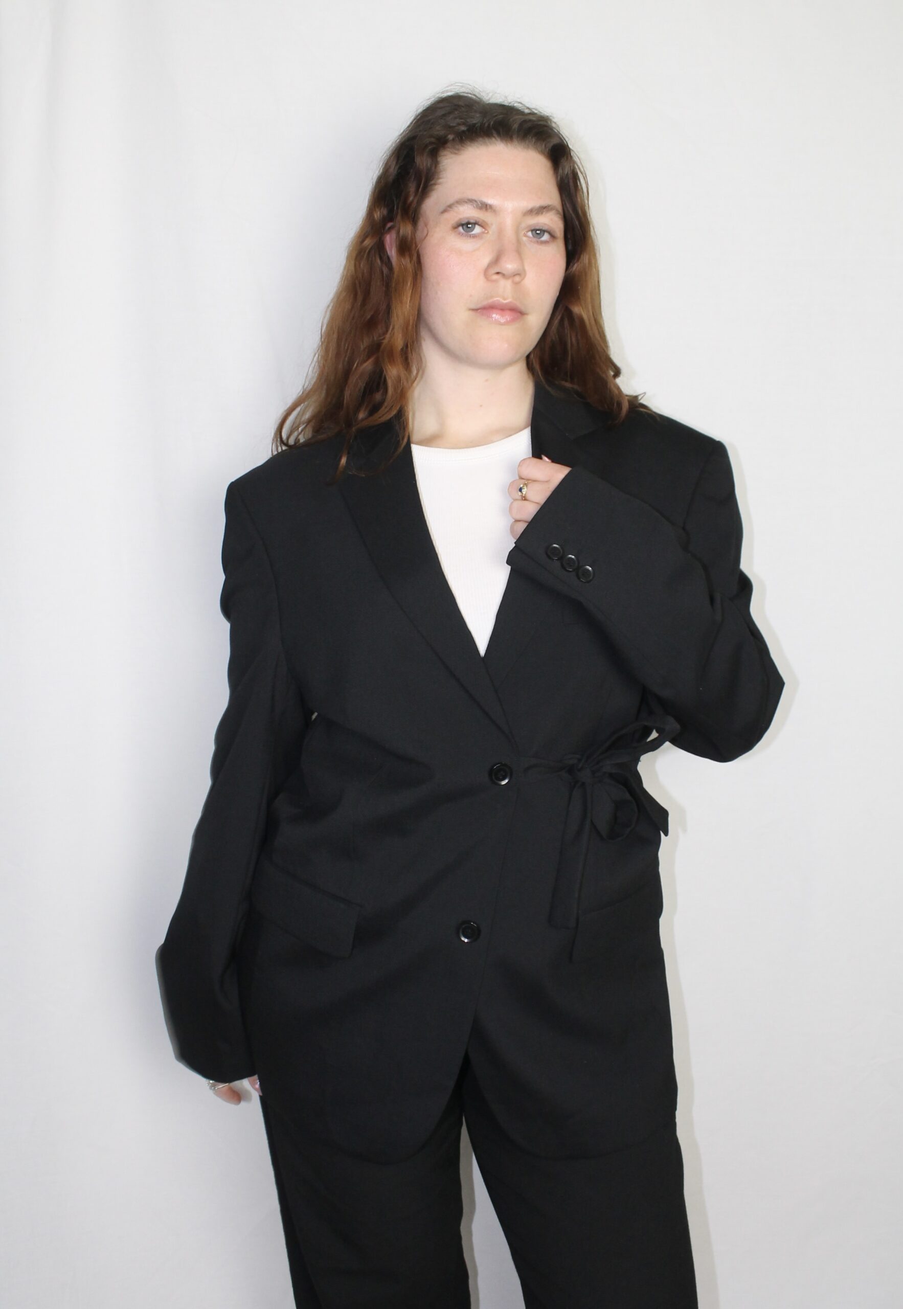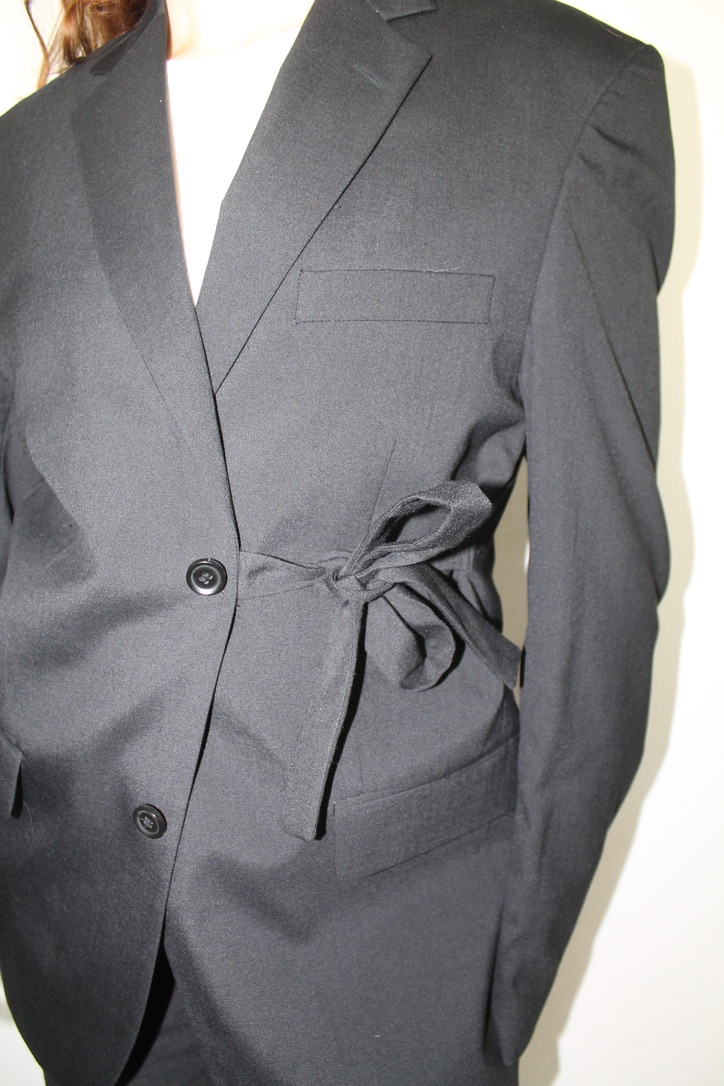 Oversized blazer, with strings to close the jacket on the side. It is possible to put the strings away, so it can be a normal blazer as well.