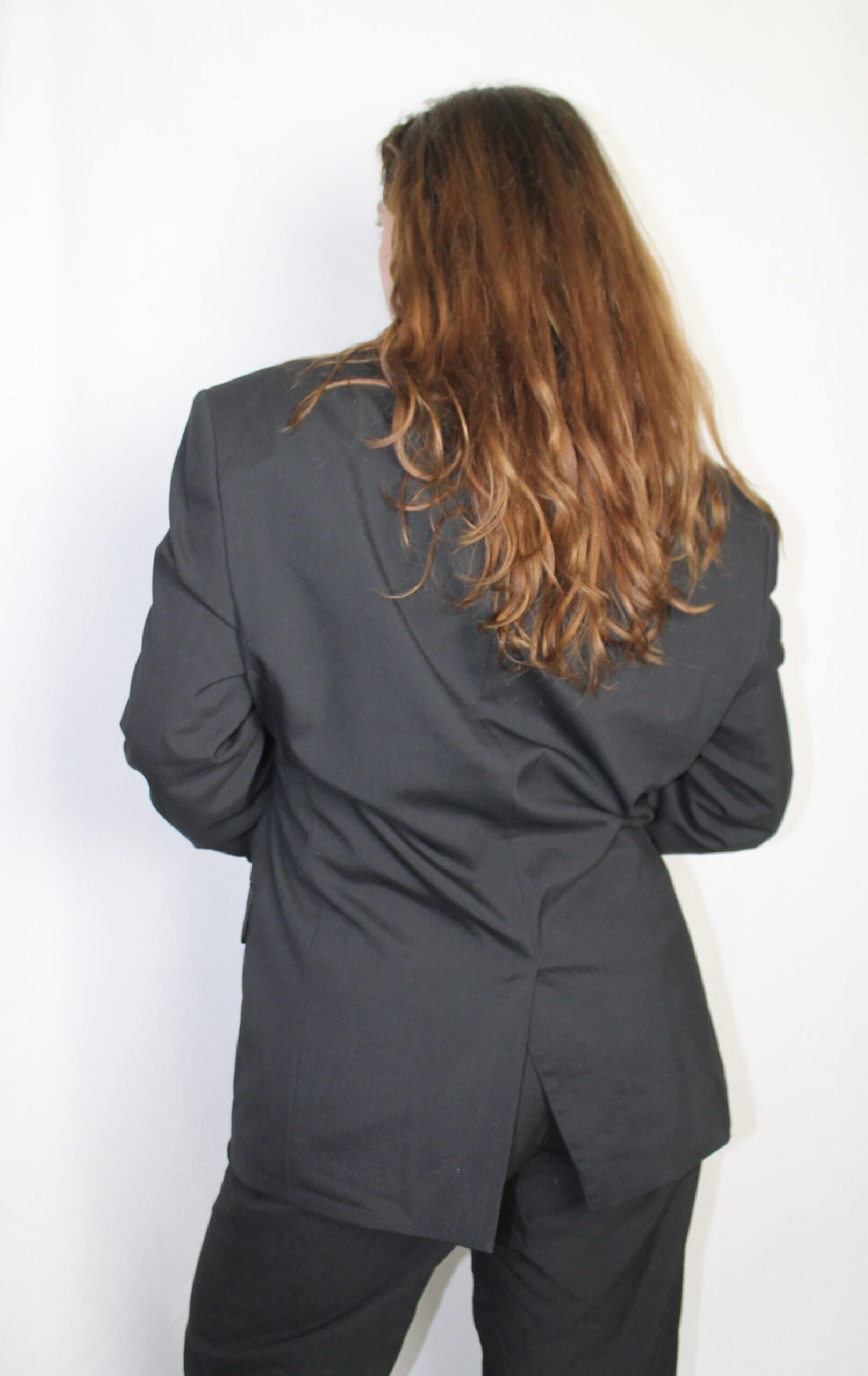 Upcycled from a men’s blazer for an oversized yet feminine look.