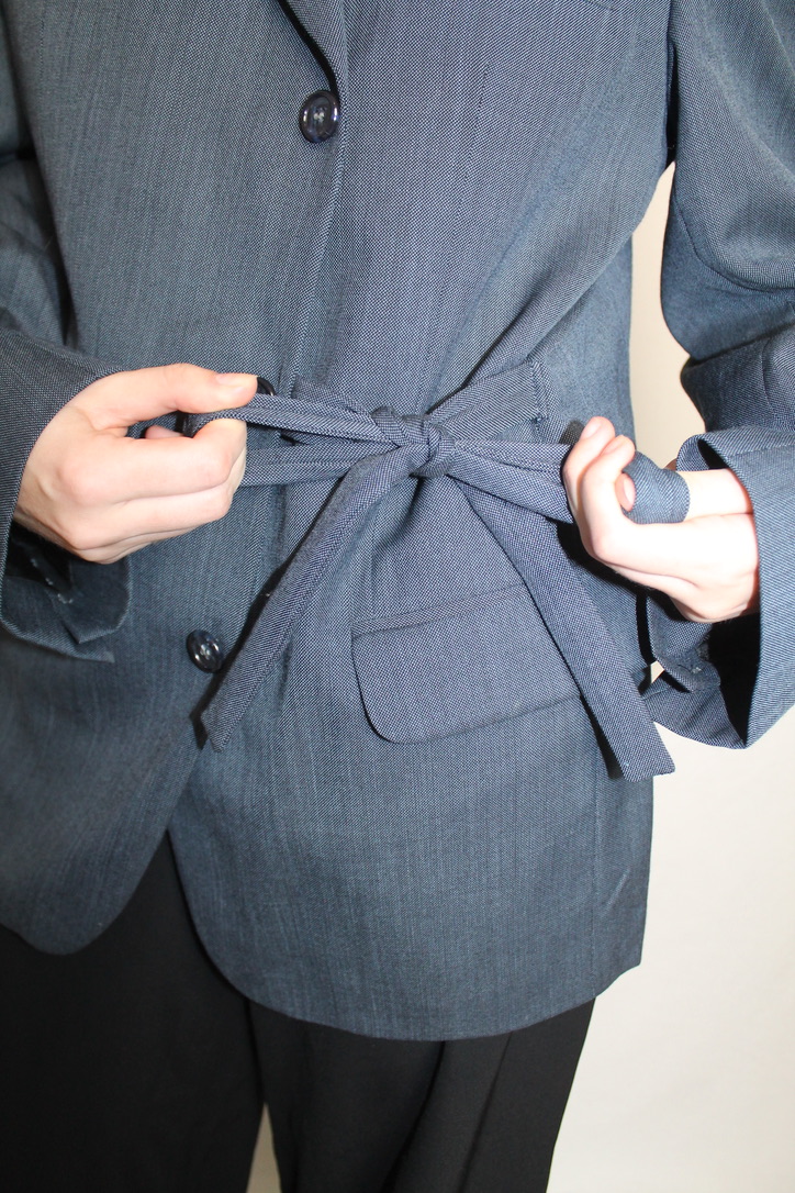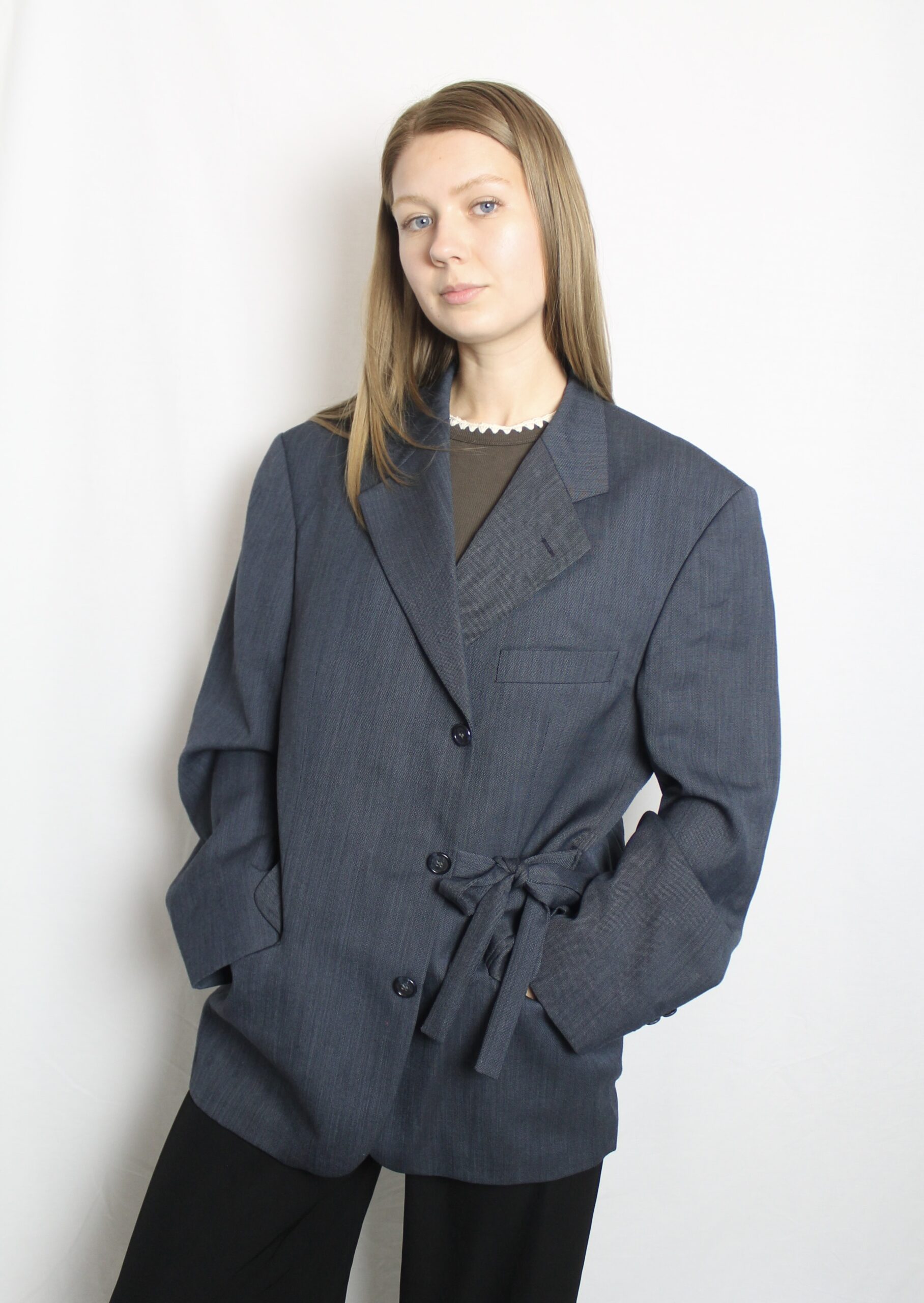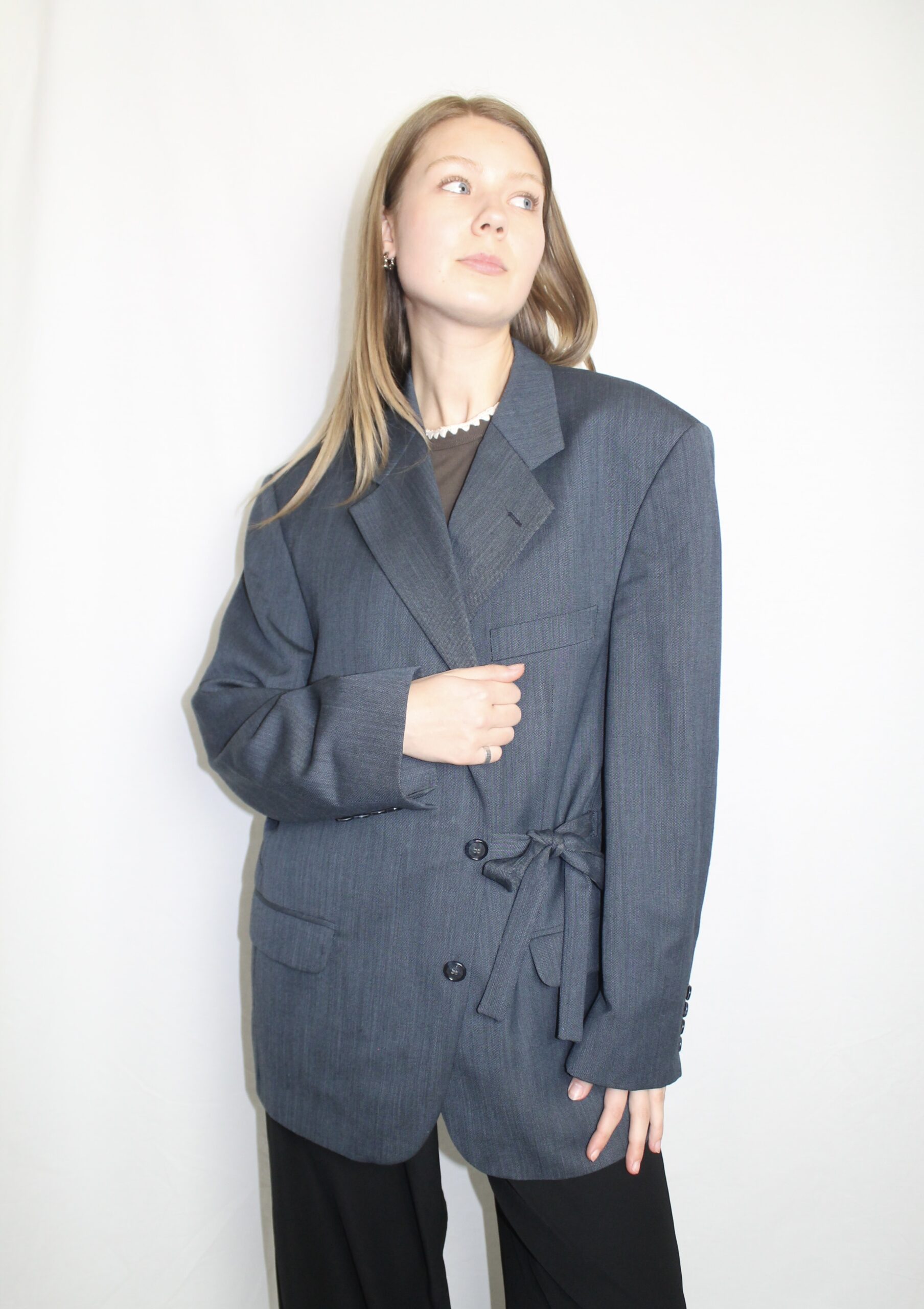 Oversized blazer, with strings to close the jacket on the side. It is possible to put the strings away, so it can be a normal blazer as well.