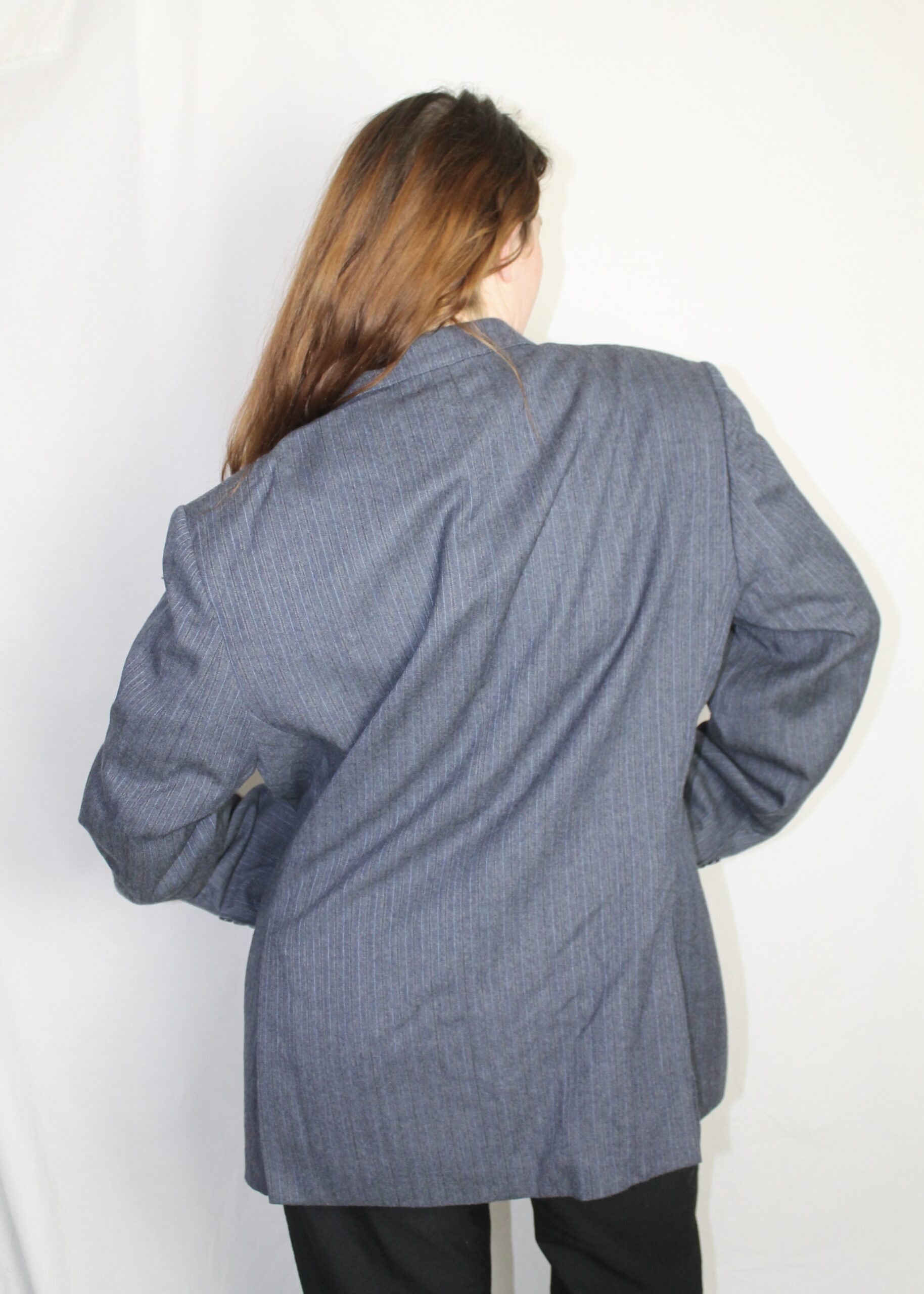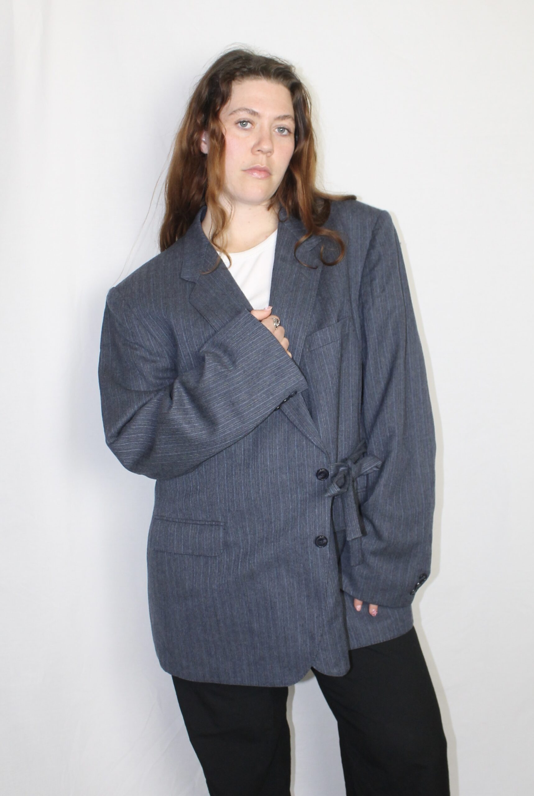 Upcycled from a men’s blazer for an oversized yet feminine look.