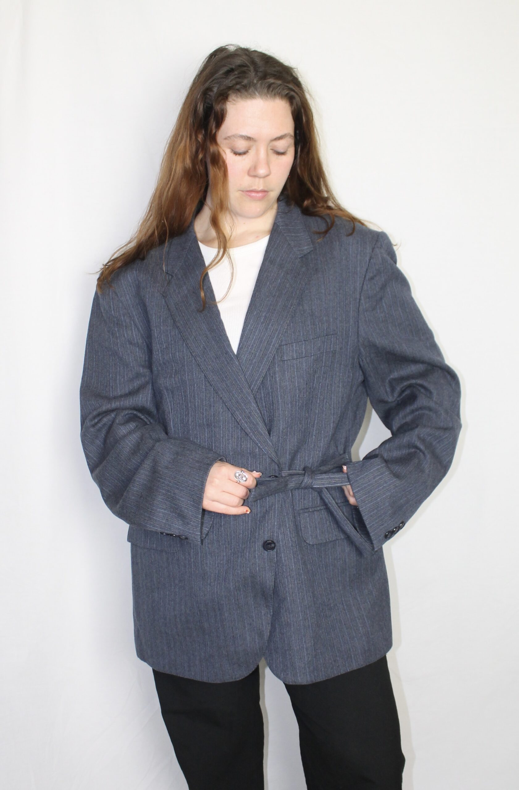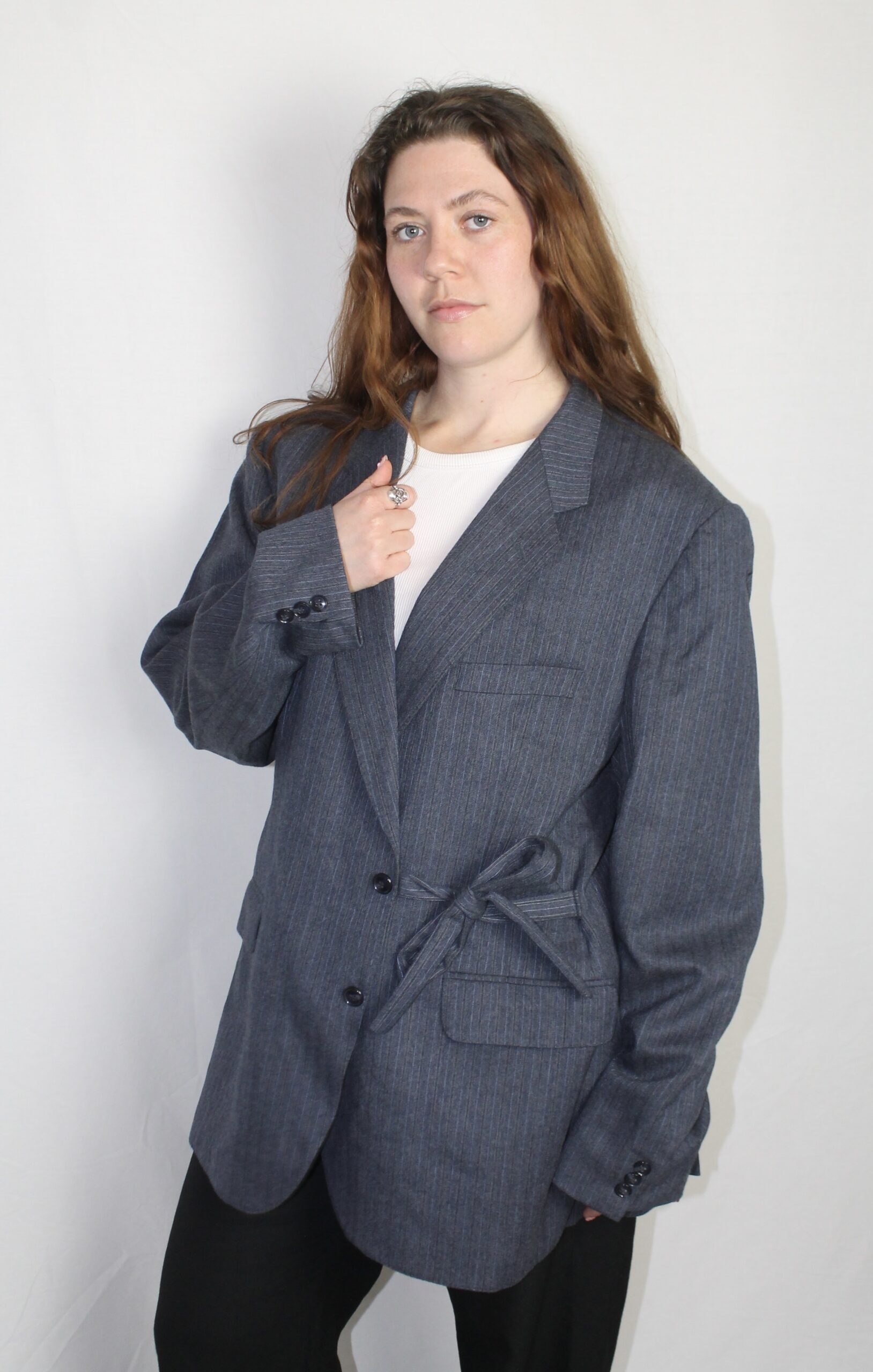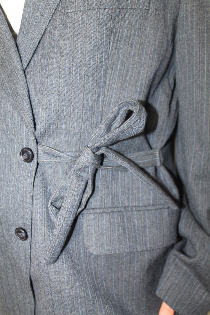 Oversized blazer, with strings to close the jacket on the side. It is possible to put the strings away, so it can be a normal blazer as well.