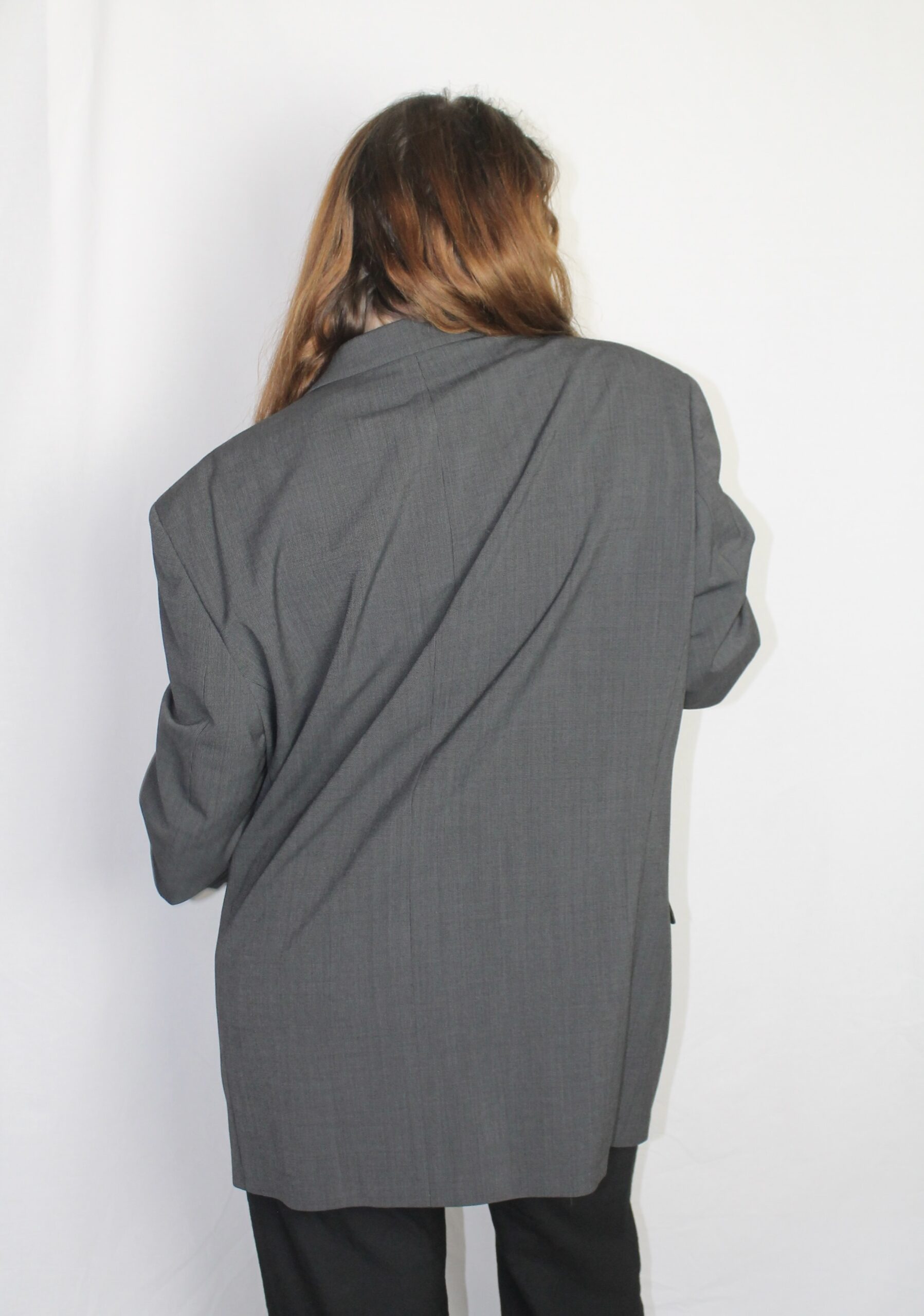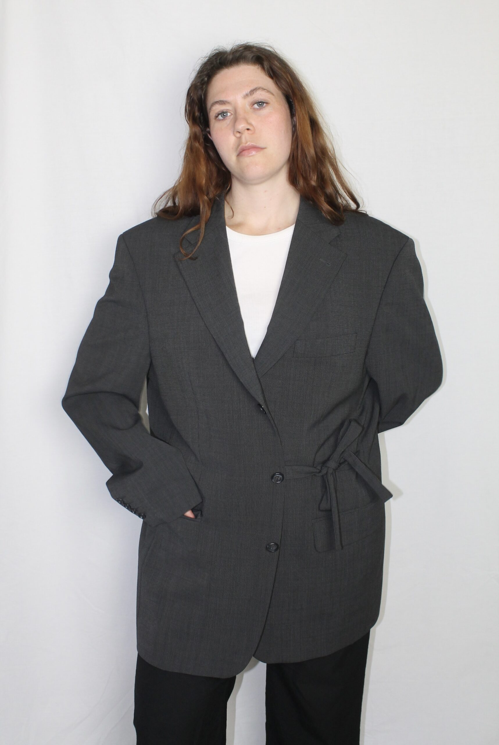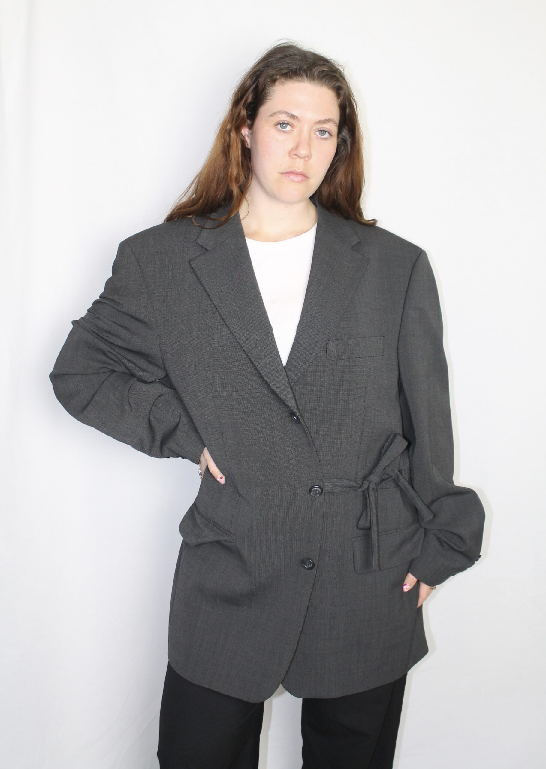 Upcycled from a men’s blazer for an oversized yet feminine look.