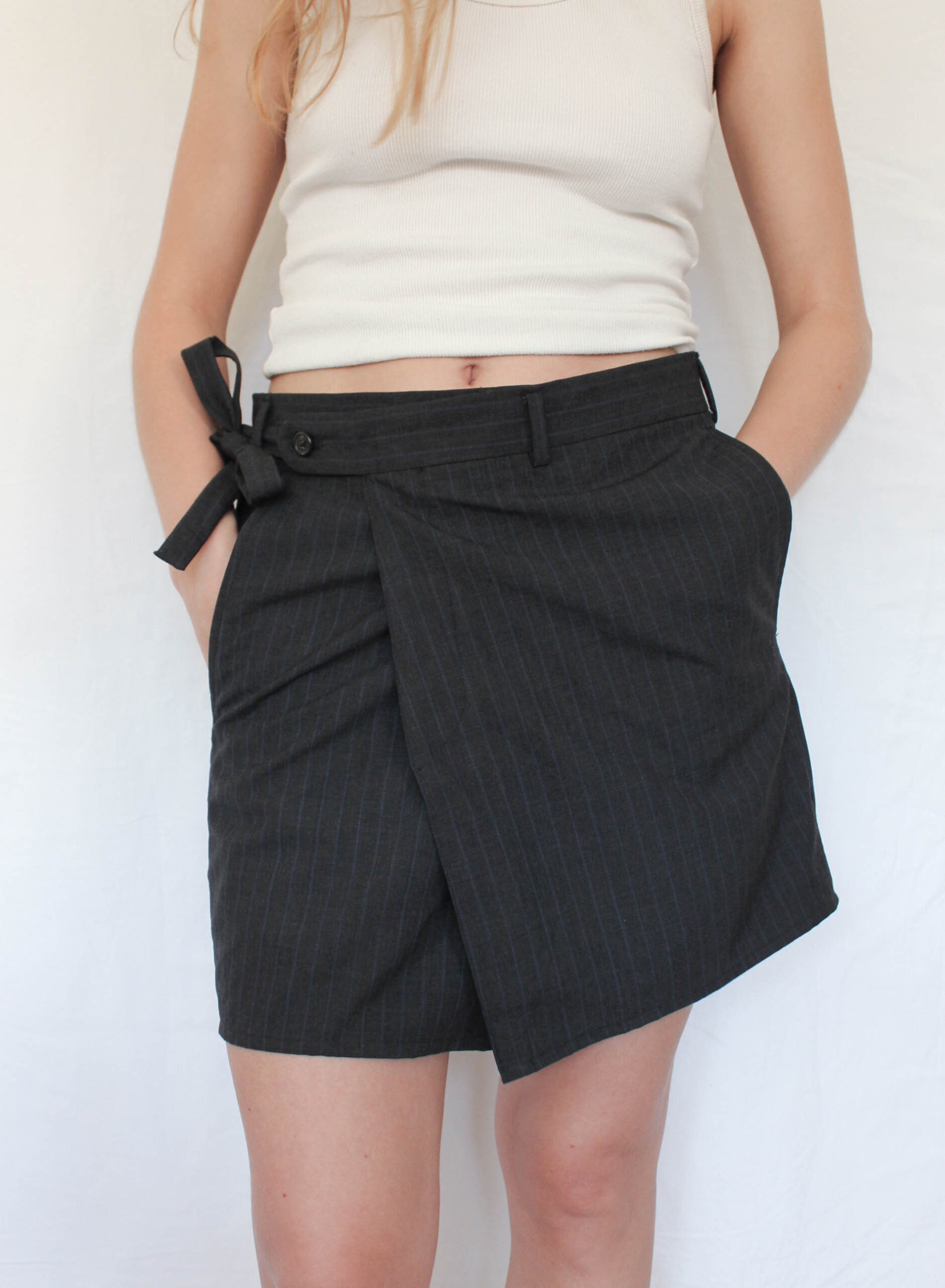 Wrap around skirt, with two strings, where one go through a hole in the back panel, to secure and tighten the skirt. Tie a knot on the side of the skirt to complete the look and secure the fitting.