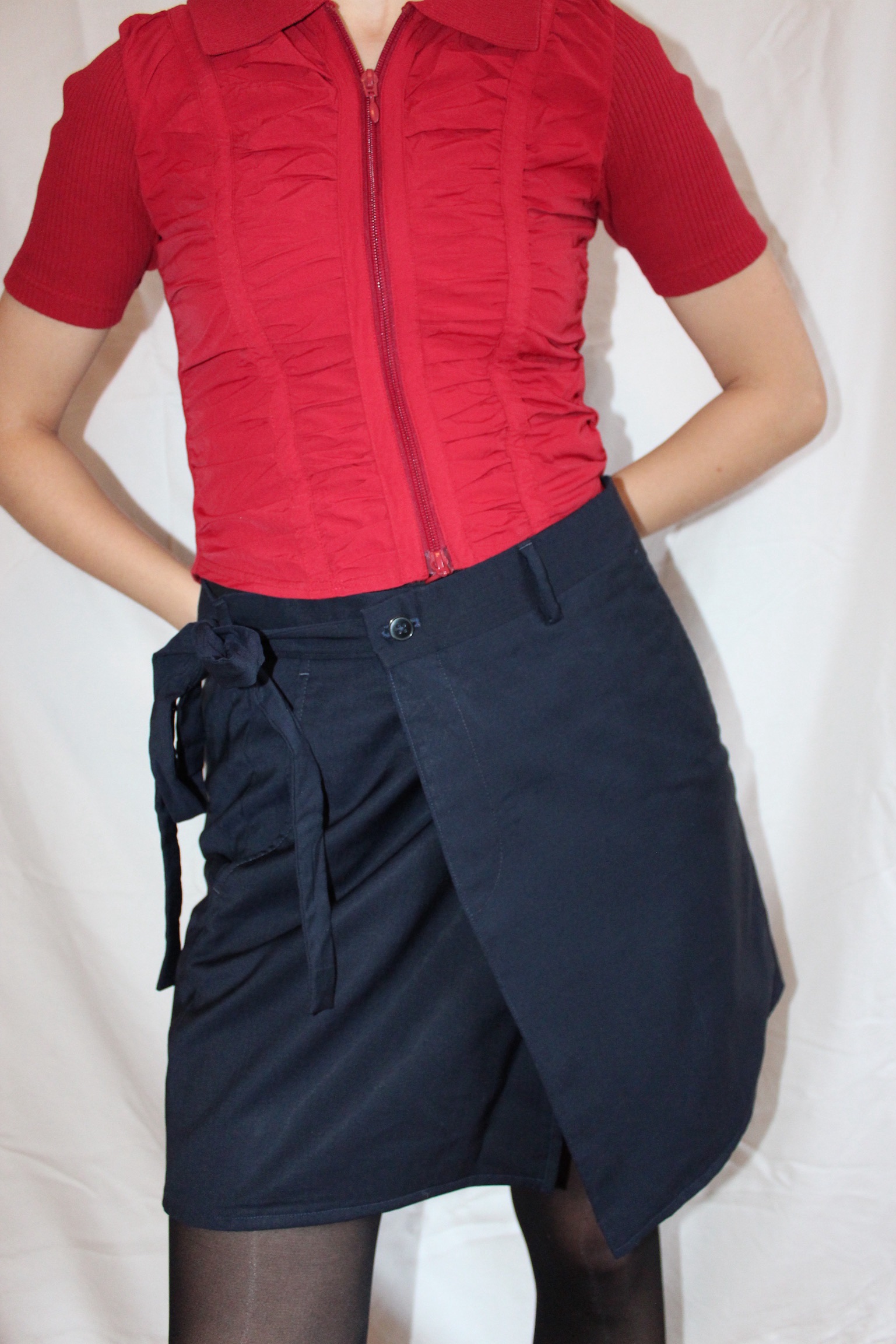 Wrap around skirt, with two strings, where one go through a hole in the back panel, to secure and tighten the skirt. Tie a knot on the side of the skirt to complete the look and secure the fitting.