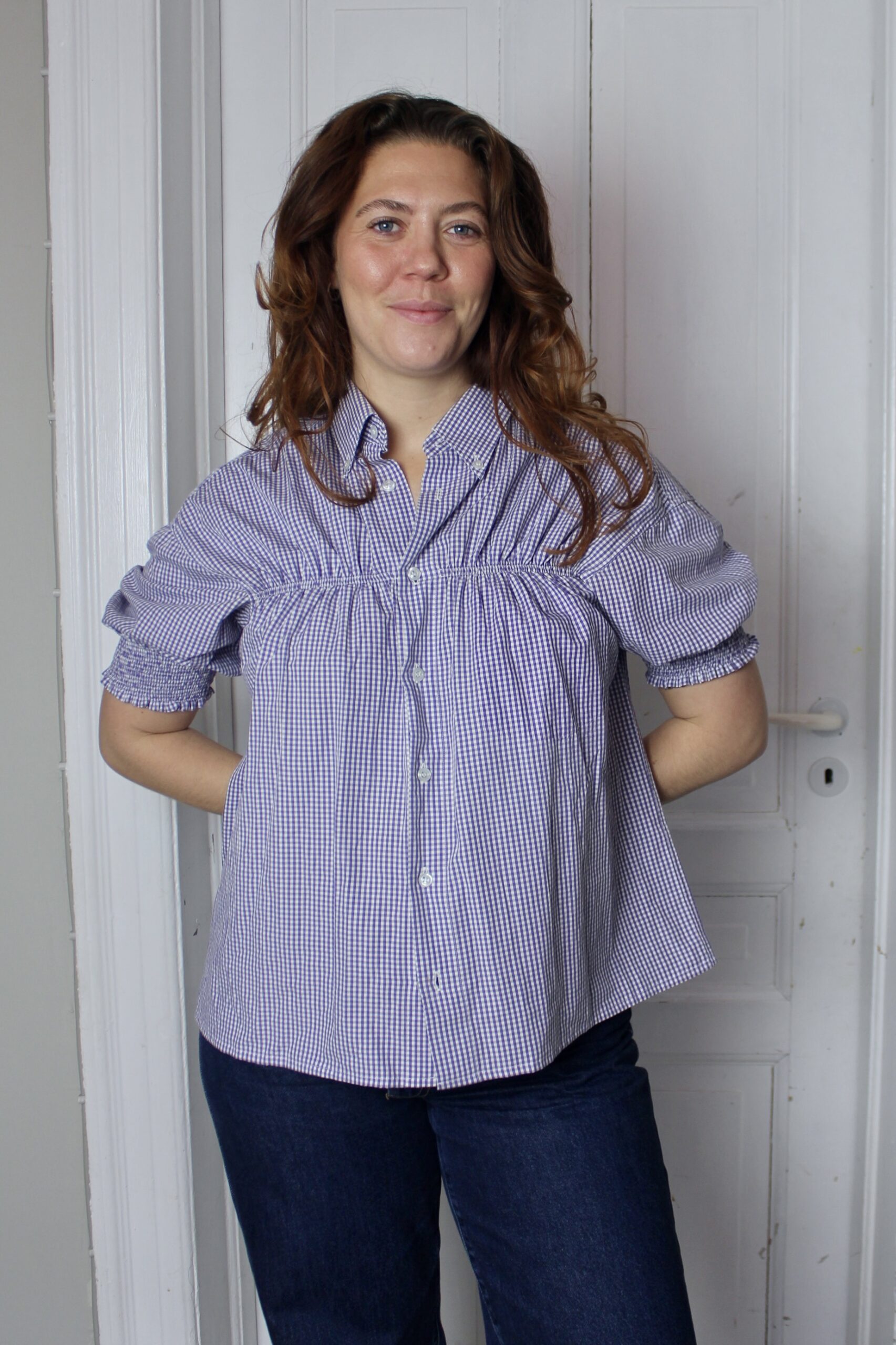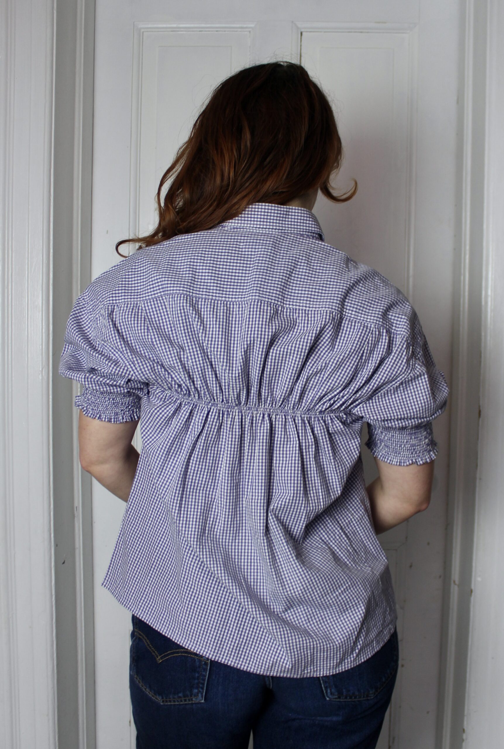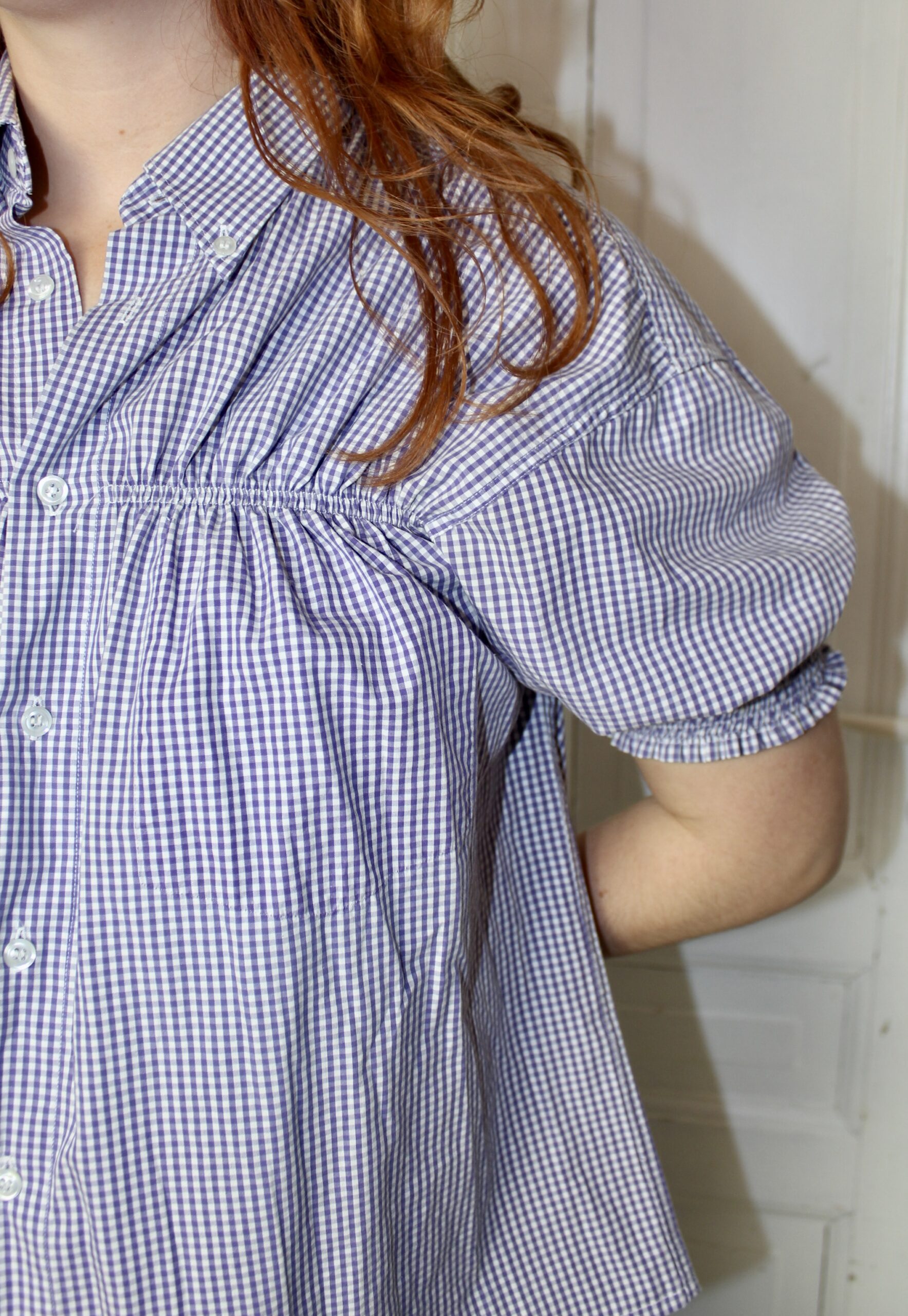 Upcycled from a mans shirt, it’s lightweight and has a stiff collar.