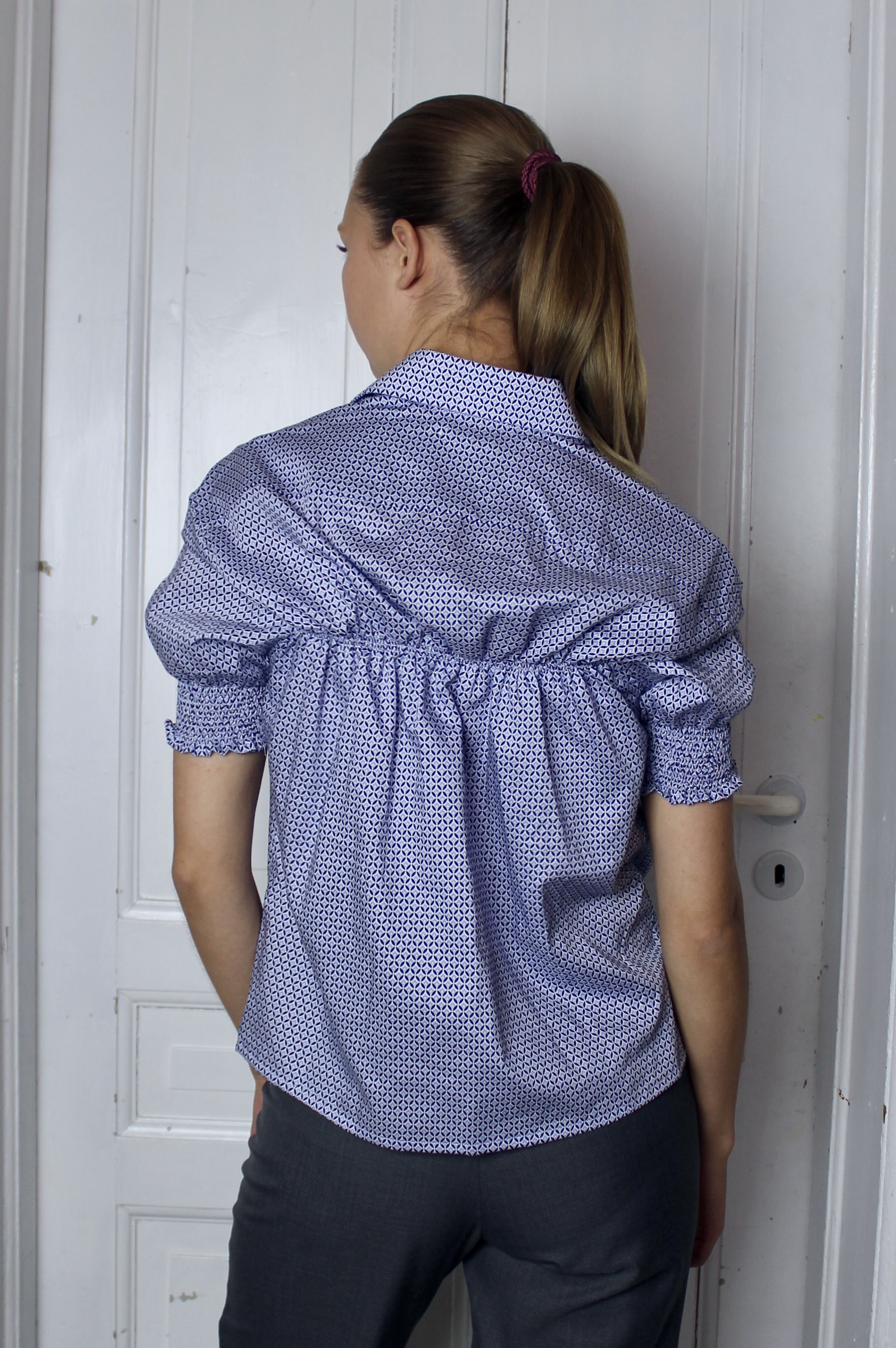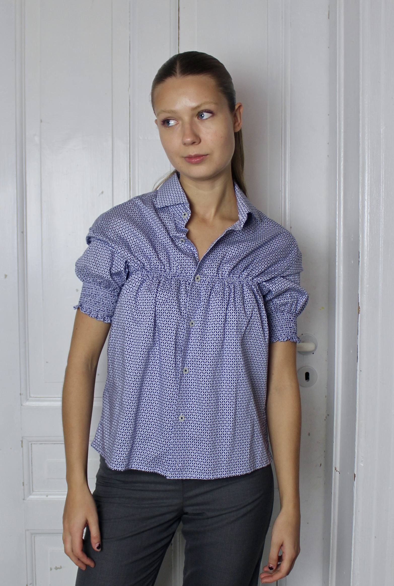 Upcycled from a mans shirt, it’s lightweight and has a stiff collar.