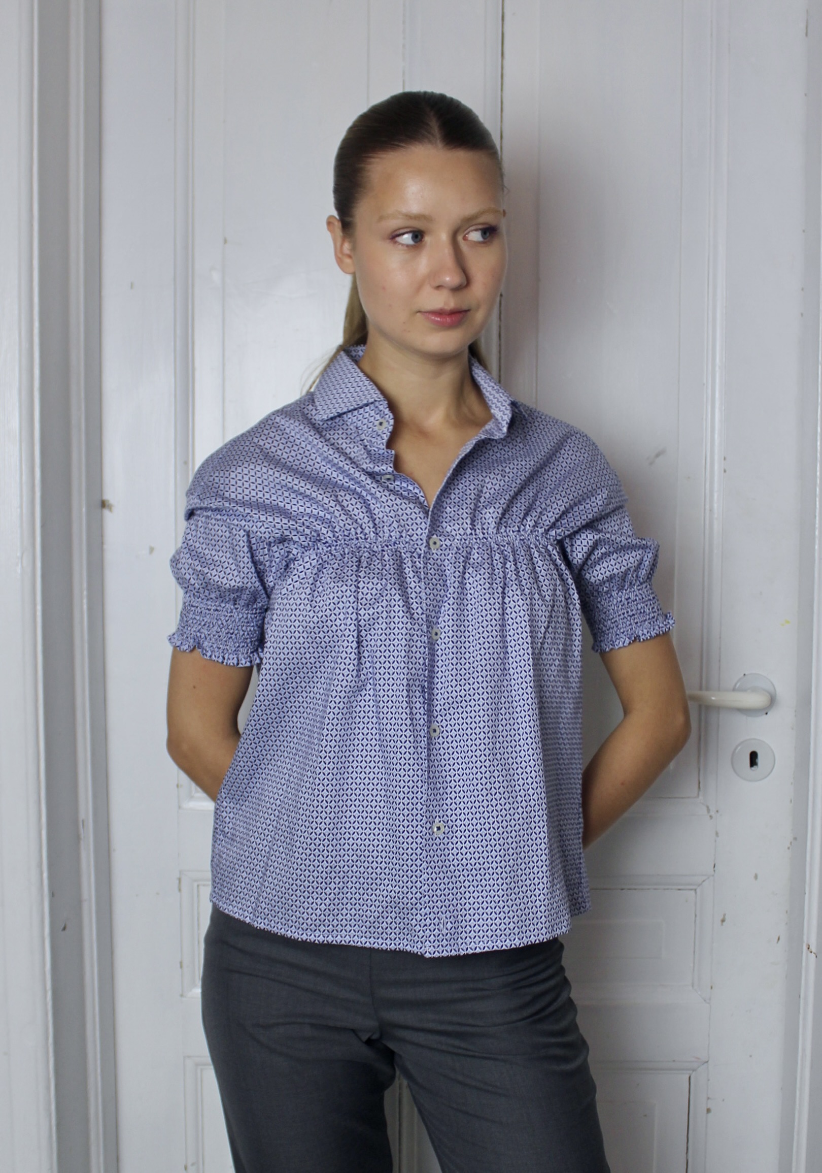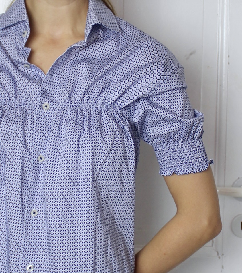 A flowy t-shirt, with elastic smock across the chest and arms.