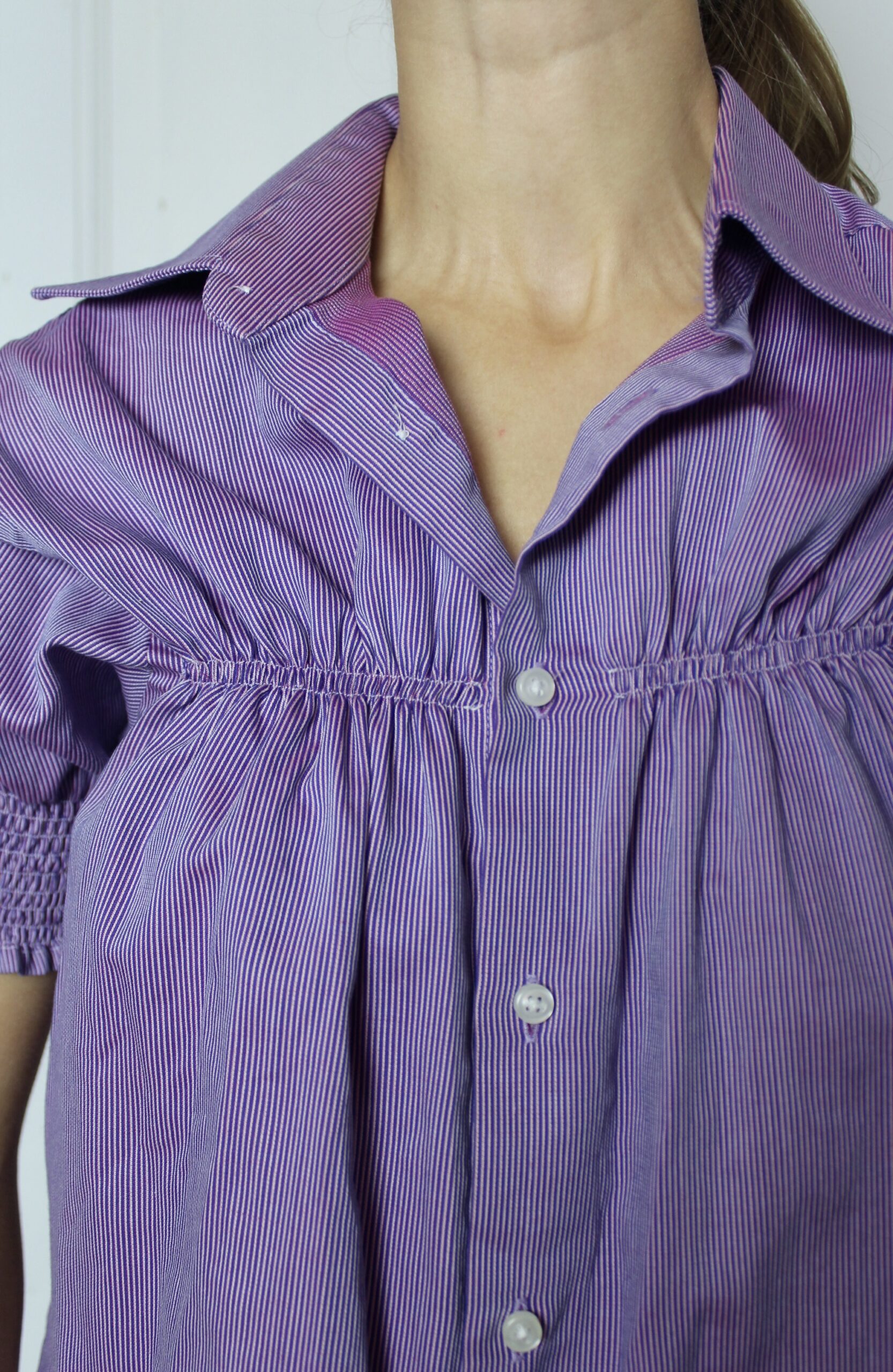 Upcycled from a mans shirt, it’s lightweight and has a stiff collar.