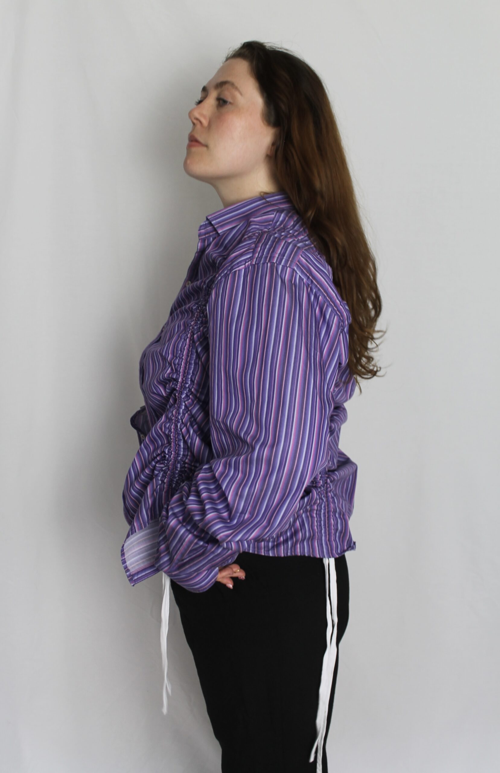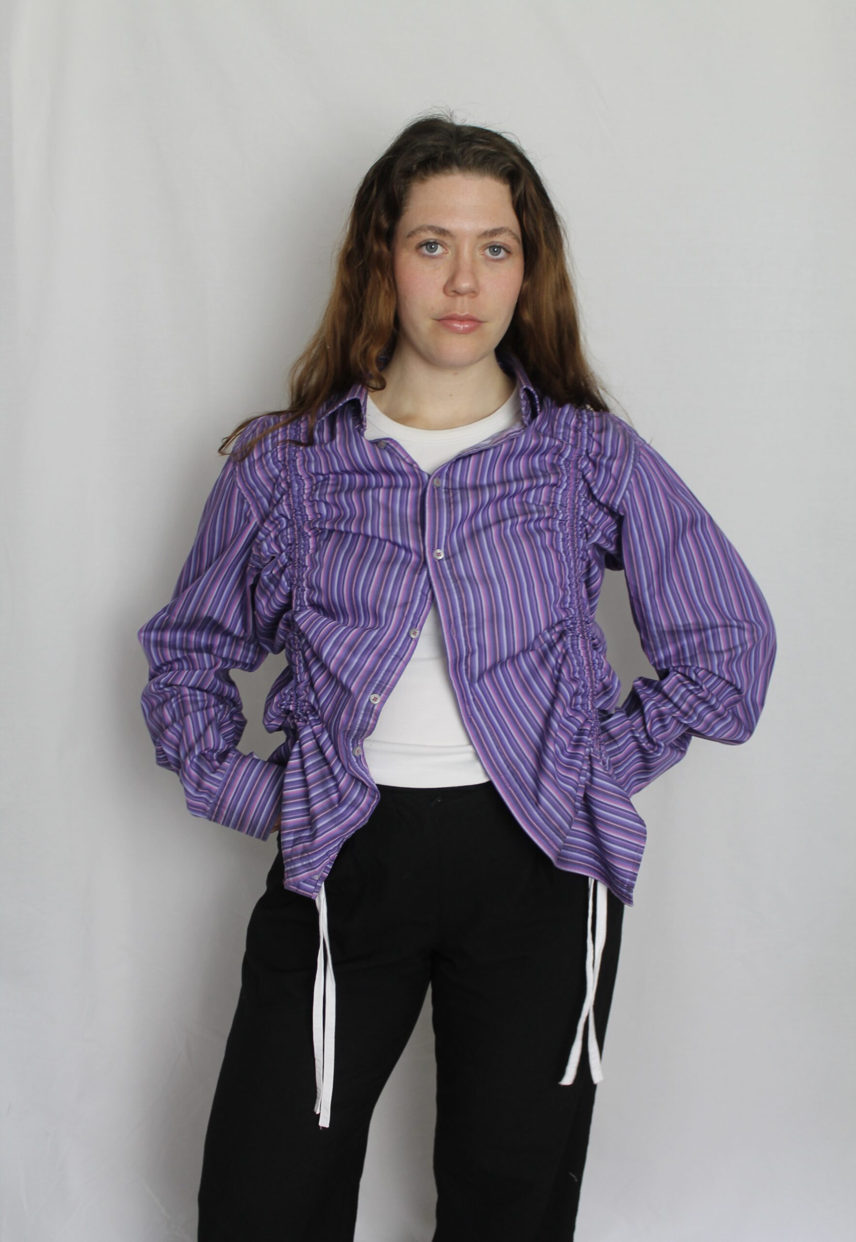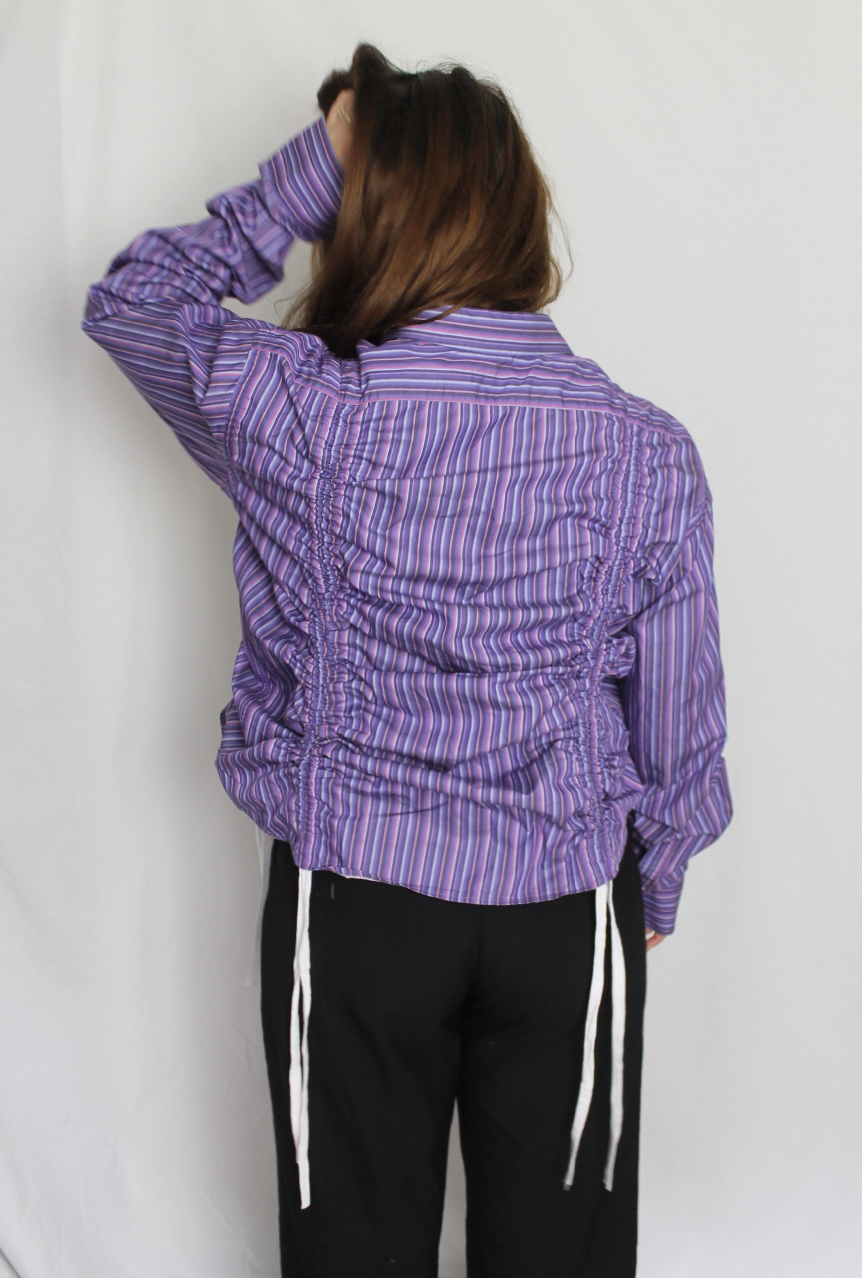 An oversized shirt, with strings in panels on the front and back to make a ruching effect.
